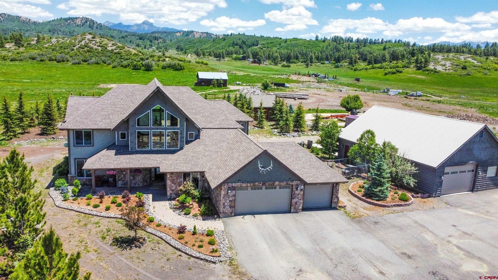 Live, Work, Play from home on this incredible 58-acre Ranch in the heart of the San Juans! The location is close to town, with access off a paved road, but tucked nicely below the south San Juan Mountain Range. The acreage is perimeter fenced and cross fenced and ready for your horses or cows. This custom home was built with all the bells and whistles and has room for the whole family. On the main floor you will find an open concept kitchen, dining and living area that are ideal for entertaining. The home includes oversized living room with 26' high vaulted ceiling, custom gourmet kitchen, oversize dining room, TV room/den, executive in-house office, gym room, 3 bedrooms, two full baths, 2 half baths, laundry room, and a spacious loft/sitting area. In this home you will find large windows framing the views, home security system, radiant in-floor heating, 9-foot ceiling on the main floor, T&G wood ceilings, custom live edge wood trim, two gas fireplace, grand elk horn chandelier, high-end stainless-steel appliances, and custom granite countertops. Bonus improvements: 36x50 heated shop; additional 36x46 D-Log heated shop with 14x36 loft for all your toys; garden shed with chicken coop. In addition to this great ranch house, you are being conveyed the "Mulch Business". It is an income producer with approximately 7000 yards of garden mulch valued around $150K. Also conveying with this sale is the equipment: an International Truck (freshly painted), power screen with conveyor, two fuel tanks, and a 926 E rubber tire front end loader. The property includes four fenced pastures, two ponds, lots of pine trees, and 6 B shares of irrigation water from the Echo Ditch.