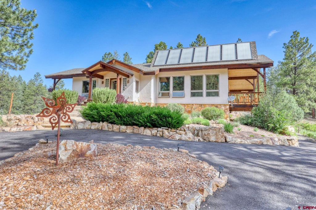 This exquisite, custom-built home located 7 miles from town is nestled among towering ponderosa pines, has mountain views and BORDERS the San Juan National Forest. Unique, end of road setting with private access to hike and explore nature off the beaten track, this property consists of five acres with an option for an additional 3.6 acres and is not in an HOA. The main home is beautifully designed and situated for solar efficiency. The interior has timber frame posts and beams, custom doors and trim, built-in wood burning fireplace accented by polished concrete hearth, Douglas Fir cabinets in baths and kitchen, granite and custom tile work throughout, open floor-plan concept with fabulous kitchen and bar, curved walls, glass block natural lighting, air exchange system keeping inside air fresh while maintaining thermal efficiency, thoughtful storage options and other creative design features not to be missed. Enjoy in-floor radiant heat throughout the house and garage provided by solar hot water exchange tank with high-efficiency boiler for back up, built-in central vac on both living spaces, including the garage. You’ll enjoy two covered decks totaling 720 sq. ft. as well as a guest suite patio area with hot tub. The master suite is on the main floor along with an office, additional guest bedroom and full bath. Downstairs is the oversized two-car garage with workshop, tons of storage and the full mother-in-law apartment or guest suite. Currently used as a short-term rental, the guest suite has a bedroom, bath, full kitchen and private entrance. Outside you’ll find the grounds beautifully landscaped with nicely laid out paths leading to the guest cabin, firepit, BBQ area, reading nook and green house. The cabin is cozy and inviting with covered front deck, private two-person hot tub, bath, kitchenette, and gas fireplace. RV parking is available with blacktop and FULL hook-ups. Cabin and guest suite are 100% furnished and ready to rent. The two lots allow you to build two more homes or cabins. Whether you’re looking for a large family home with plenty of room for guests, a family or corporate retreat, or a home with additional short term rental options, this property has it all.