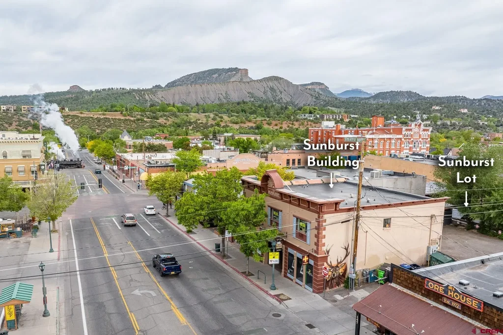 The Sunburst building, with an adjacent developable lot, is steps away from the vibrant crossroads of College Drive/ Main Ave. and one short block to the historic Durango-Silverton train depot. The train attracts 225,000 yearly passengers and contributes $525,000,000+ to our local economy. This dynamic building and adjacent lot with coveted alley access is prime for redevelopment or long term investment. The building has been very well maintained by the owners and tenants, and enjoys a long history of stable occupancy with three renovated leased spaces, two at street level and one upstairs (the businesses are not for sale). There are options to reconfigure the space for more units or merge for larger spaces. The attractive exterior presents unparalleled street and passerby visibility with large showcase windows and lighted space for signage.