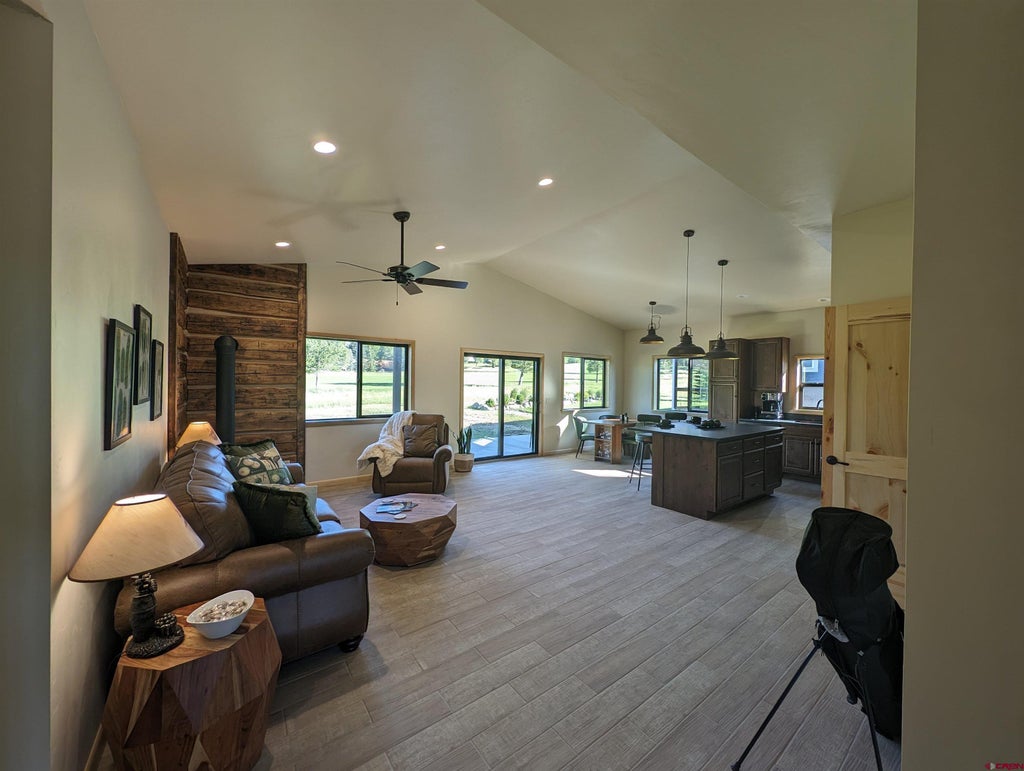 Open House Friday August 29th 11am-1pm. Welcome to your NEWER BEAUTIFUL CUSTOM GOLF COURSE Home Aka "BACK 9" This stunning 1550 sq. feet custom gem features 3 bedrooms 2 baths, 2 car oversized garage. This home is built slab on grade so no crawl space to collect moisture! As you enter under the covered entry with custom reclaimed wood featured accent wall & then you open the custom glass door & you will see the OPEN FLOOR PLAN Living Room, Kitchen & Dining room which includes custom wood look tile flooring throughout, VAULTED CEILING, reclaimed wood feature wall behind the free standing GAS FIREPLACE, Granite counters with copper sink with an abundance of counter space & cabinetry, large dining area with sliding glass doors out to the covered patio which backs to the golf course. Custom solid bettle kill pine wood doors & trim, modern ceiling fans, sound proof insulation in the walls, light & bright with large windows. Down the short hall on the right you will enter the master ensuite with 2 copper sinks set in granite counters, walk in custom tile surround shower & pebble stone shower flooring, walk in closet, linen storage & across the hall is 2 guest bedrooms with large windows for the views, they share a bath with custom walk in tile surround shower & it has the pebble stone floor as well. The oversized garage features the furnace, wall heater & on demand water heater. The owners just planted grass seed & a few trees for you to enjoy. Living in the Pagosa Lakes area also allows you to have use of the recreation center with community indoor pool, jacuzzi, fitness center, handball courts etc.. It is open 12 months a year, also features parks, pickleball, Tennis & other sport courts, walking trails, FISHING LAKES & very near National Forest for hiking, biking, snowmobiling, cross county skiing, snow shoeing and more. Watch the Hot air Balloons take flight each morning while enjoying your morning Joe out on the covered patio. TV's included. call me today for a showing you will love this NEWER home!