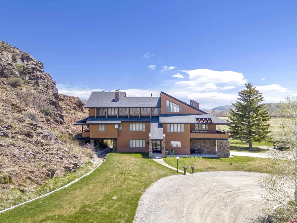 Welcome to this exceptional contemporary modern home on 17 acres along the Tomichi Creek, just minutes from downtown Gunnison. Nestled against dramatic rock outcrops, the property offers private wade in access to miles of one of the valley’s most celebrated fisheries, along with tranquil ponds, irrigated pastures, and expansive manicured lawns that create a one of a kind riverfront retreat. To the south, the land adjoins 249 acres of protected State Wildlife Area, ensuring lasting privacy and safeguarding the Tomichi Creek corridor. Beyond that, vast BLM acreage expands both the sense of seclusion and the opportunities for year round recreation. The home itself blends seamlessly with this natural setting. A grand foyer and central staircase set the tone, leading to thoughtfully designed living spaces filled with character and light. The formal living room is a showpiece, anchored by a dramatic stone fireplace and accented with Mid Century Modern details. The kitchen is both functional and inviting, with generous cabinetry and a cozy eating nook that frames views of the surrounding landscape. Just beyond, the formal dining room provides an elegant setting for hosting family dinners or special occasions. A more relaxed sitting room, complete with built in bookshelves and a brick fireplace, opens to a covered porch where the ponds and valley stretch out before you. The primary suite is a retreat of its own, offering a private office, deck, and striking views of the lawns, pastures, and rock formations. On the upper level, two additional bedrooms, a full bathroom, and a seating area open to a deck with panoramic views to the east and across the Gunnison Valley. Every detail of this property reflects a strong connection to place. Unique finishes and timeless Mid Century Modern touches complement its convenient location near Gunnison, Western Colorado University, and the Gunnison/Crested Butte Regional Airport. This home offers not only a rare property, but also a rare lifestyle.