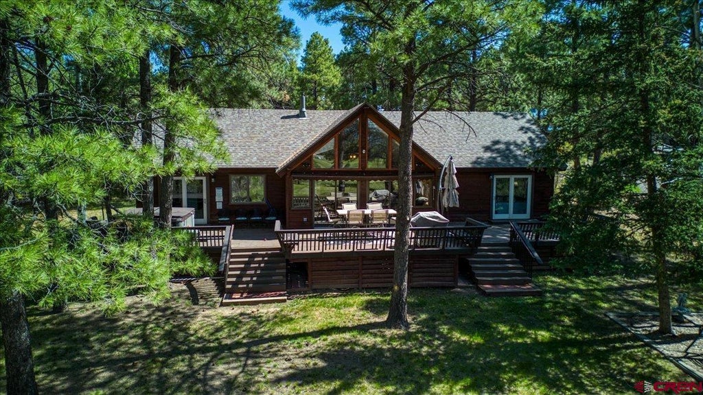 Mountain Living Meets the Golf Course! Huge deck just off the 18th teebox, surrounded by lots of wooded space full of deer (seriously.. so… many… deer…). Occassionally Mr. Fox wanders through as well. Surrounded by mature Ponderosa Pines and Aspens, it’s hard to believe you aren’t out in the middle of the mountain forest. The floor plan separates the primary bedroom from the guest rooms and the open great room has 2-story windows with views all the way to Broken Off Point. Laundry room doubles as hobby area and has plenty of storage as well. This single story mountain cabin is ready for a new owner to call home. It is a very successful vacation rental, however, also a suitable primary home or 2nd home get-away. The neighbors are a fun bunch that love an occasional cul-de-sac BBQ and corn hole tournament. Enjoy a relaxing soak in the hot tub under star-filled skies after a day of hiking, biking, fishing, or skiing. Trout stocked fishing lakes within 5 minutes, 5 minutes to the golf clubhouse for the inexpensive public golf course, 5 minutes to disk golf and mountain bike trails. Pickleball your thing? Less than 10 minutes to Historic Downtown Pagosa, the pickleball courts, river and world famous Pagosa Hot Springs. Or 10 minutes to Uptown’s grocery stores, hospital, and mountain eateries. Perfectly situated for both convenience and adventure. Golf, trails, fresh air, and space to breathe—this is the Pagosa lifestyle at its finest.